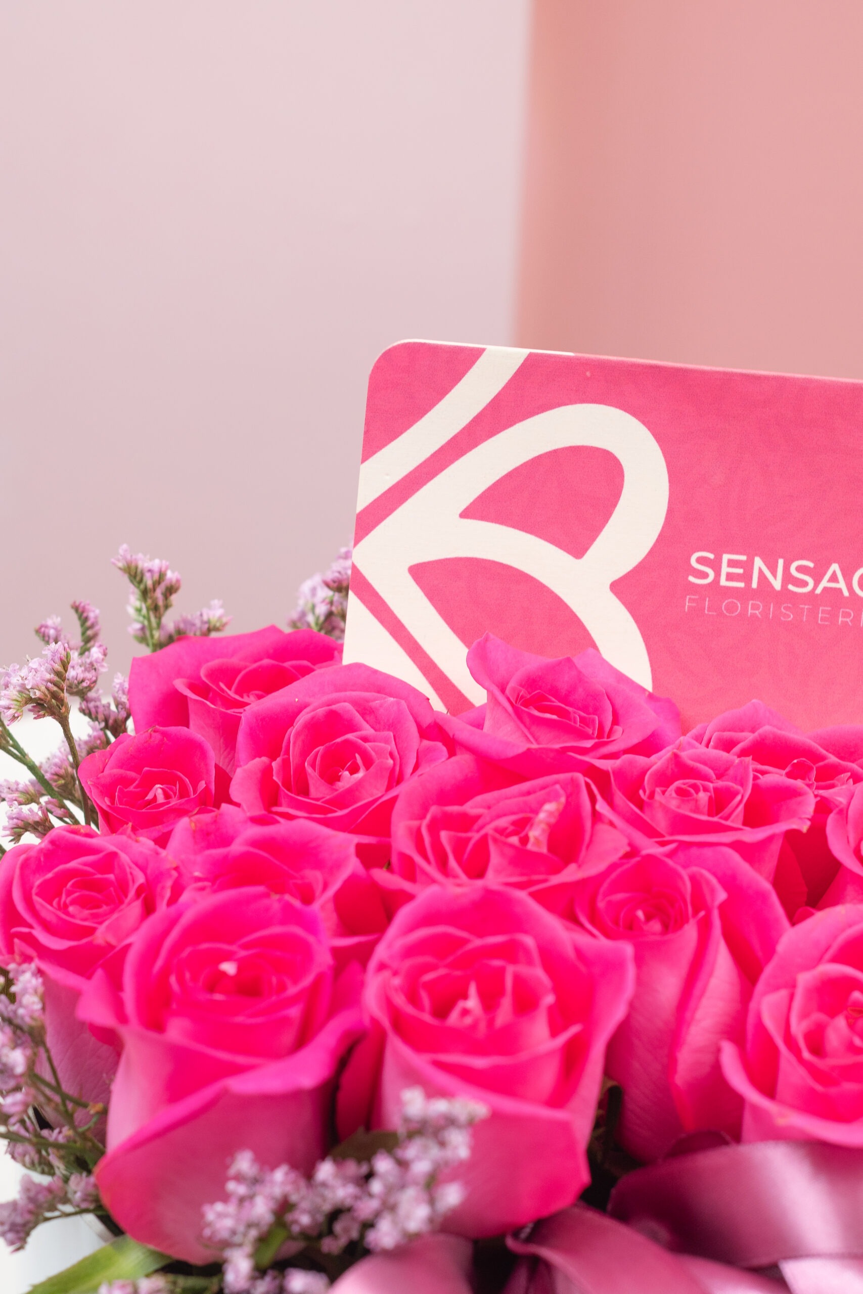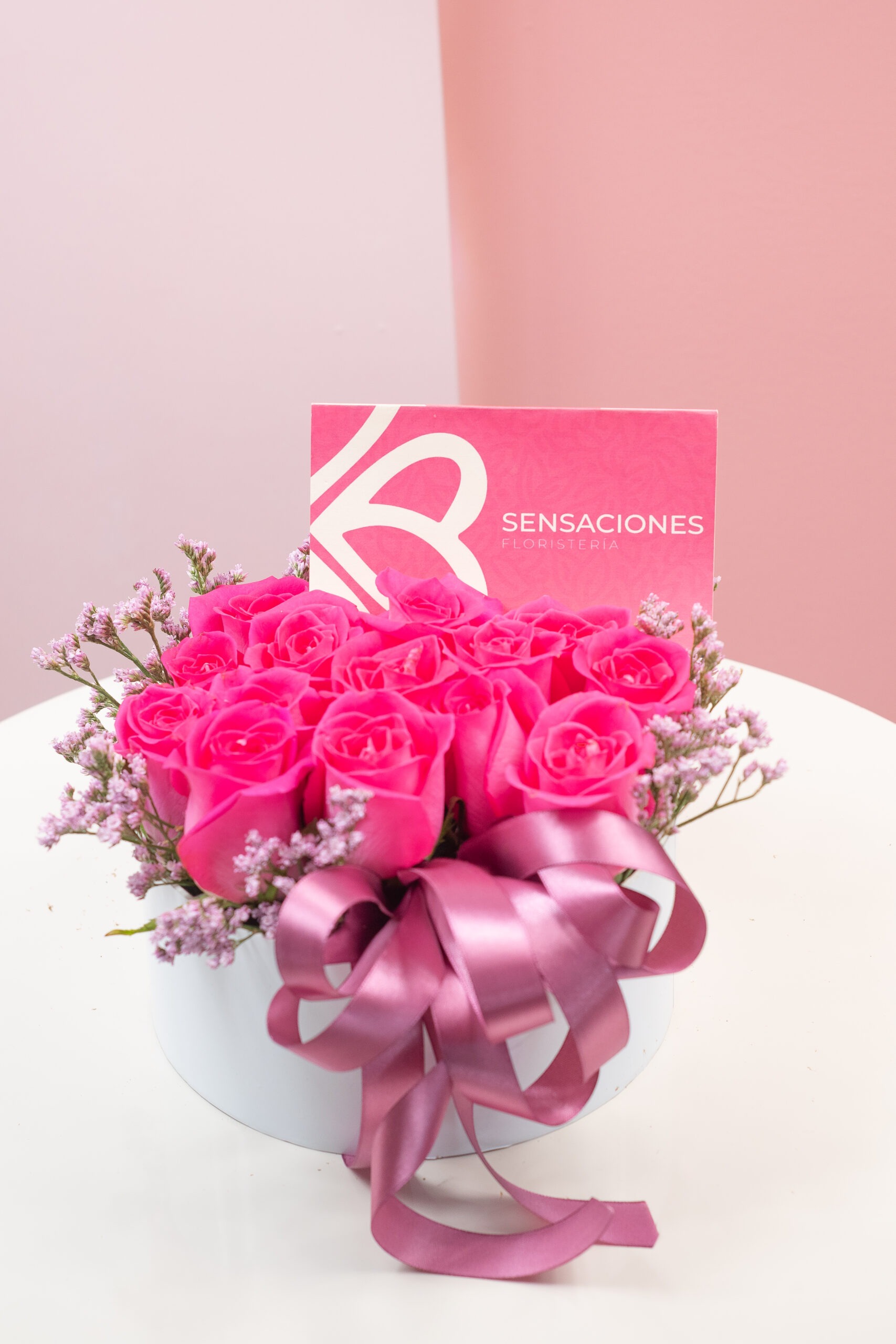 18 Rosas tonos rosados 1 Caja redonda #2 1 Decoracion 1 Tarjeta personalizable