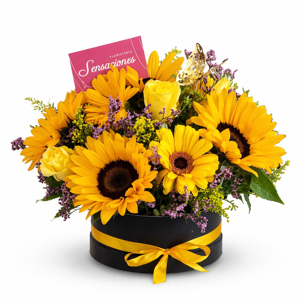 Caja de girasoles, rosas y gerberas