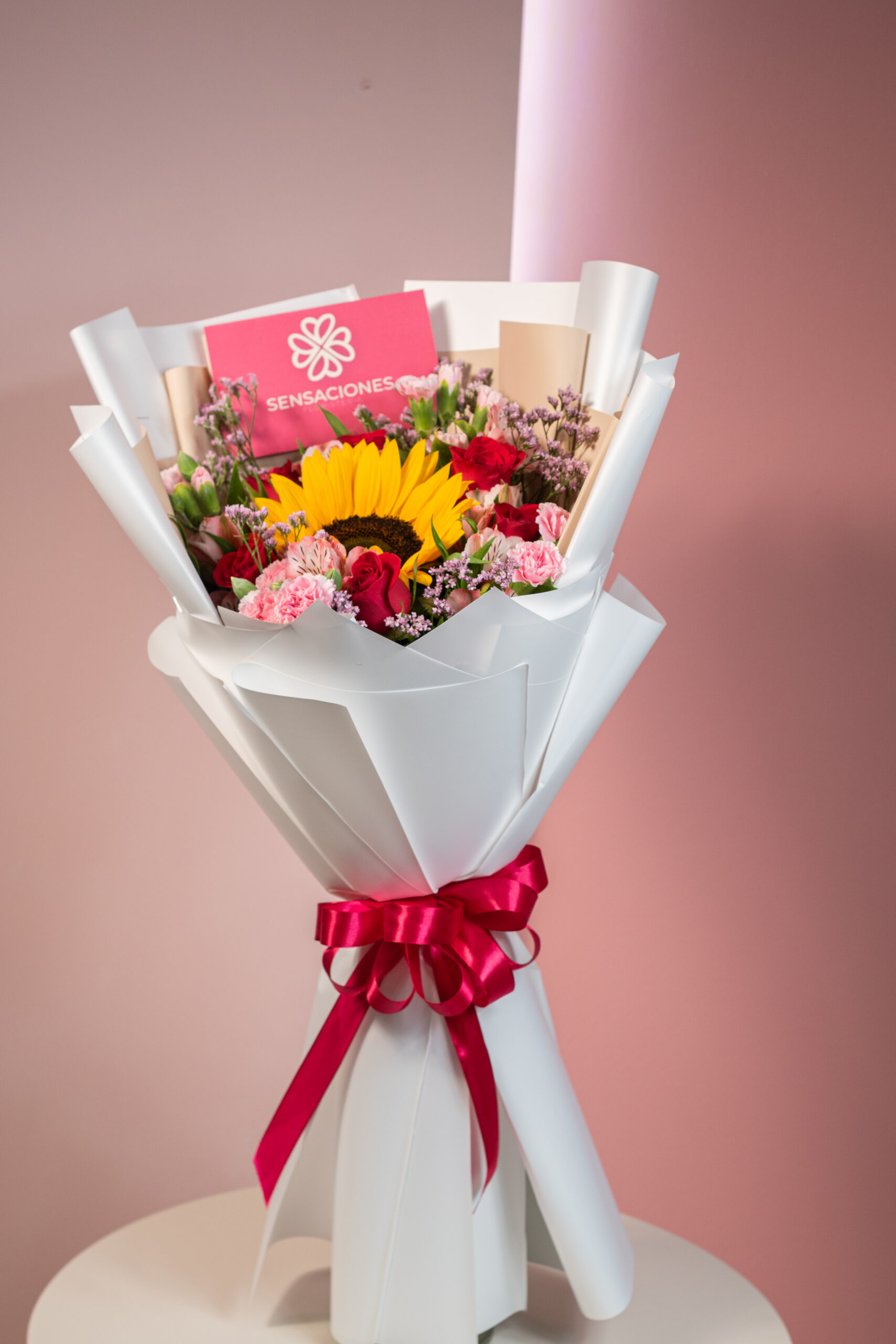 El obsequio indicado para esa persona que ama las flores, arreglo de girasoles y gerberas con un toque de elegancia, ideal para cualquier ocasión. – 101305075